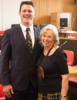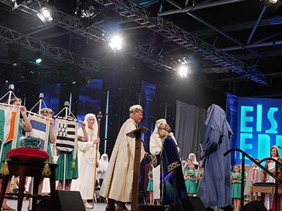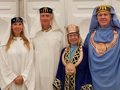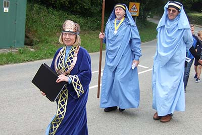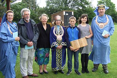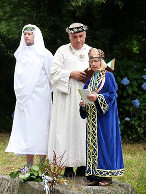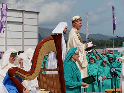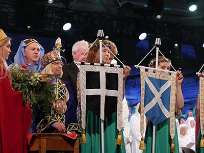 The first week of August the Grand Bard and Deputy Grand Bard went to the Welsh National Eisteddfod, which was held this year in Llanrwst in Conwy, N Wales. The Maes was in a big field full of marquees under the beautiful mountains. It was a lovely setting. On Monday there was the Gorsedd Circle ceremony, where new members were received, and luckily the sun shone. In the afternoon was the crowning ceremony, the poetry prize, in the Pavilion. On Wednesday it was the Prose Medal ceremony, also in the Pavilion. There was a warm welcome from the Welsh Gorsedd. The Grand Bard and Deputy Grand Bard were also very pleased to meet the delegates from the other Celtic countries.